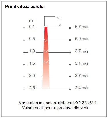| Alte detalii | Δt- cu cat creste temperatura aerului evacuat atunci cand perdeaua de aer functioneaza la putere maxima, iar ventilatorul functioneaza pe treapta min/max de viteza. Nivelul de zgomot este calculat la o distanta de 5m fata de unitate, factor directio |