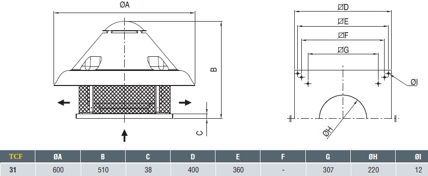 Ventilatorul ELICENT TCF se monteaza pe acoperis si are refulare orizontala.