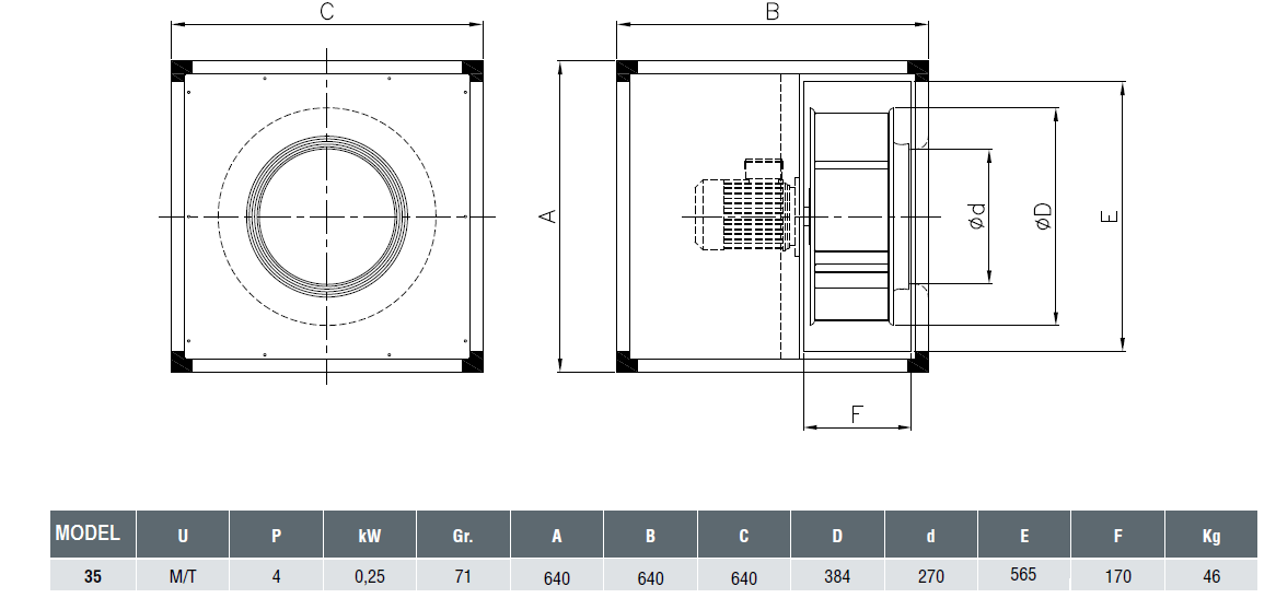 - rotor cu lamele orientate inapoi din otel galvanizat, balansate dinamic, in conformitate cu ISO 1940;